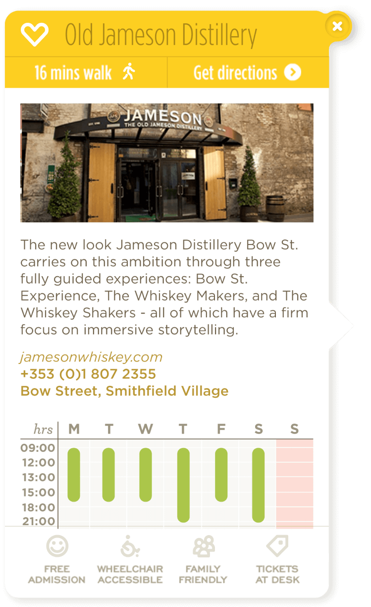 To assist visitors in quickly accessing relevant information and displaying it elegantly, we designed a simplified map featuring key locations and attractions throughout Dublin. The map was orientated by the user’s current location at the Tourism Information Office. Visitors could browse through over 300 key attractions within Dublin.